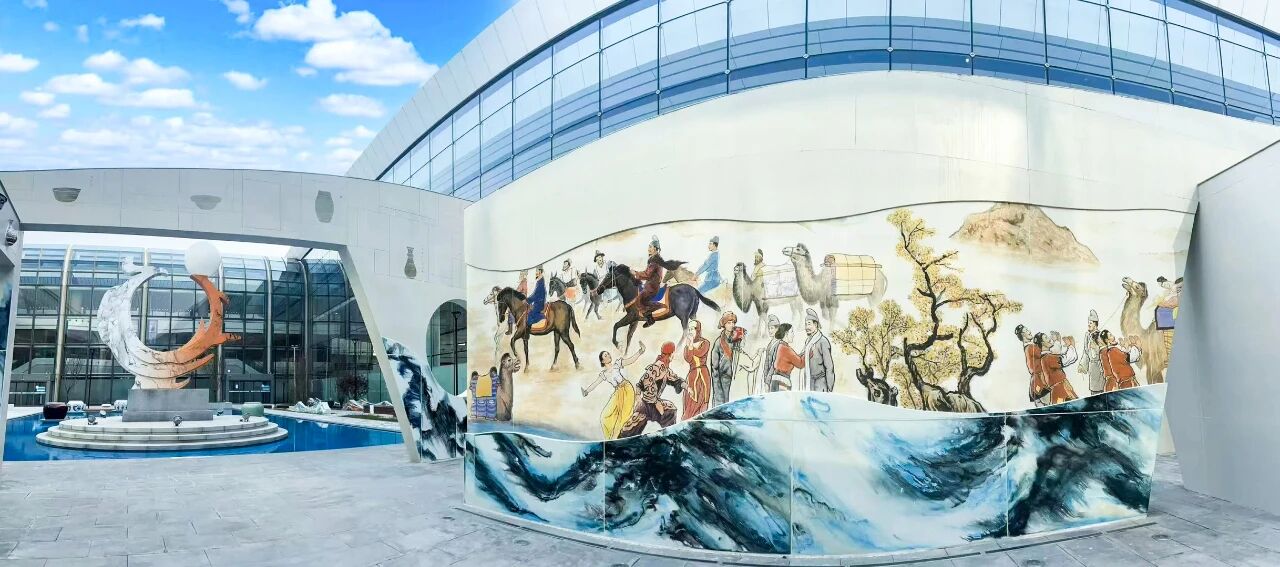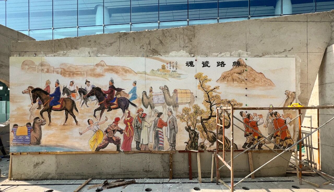 陶藝文化墻墻體上鑲嵌著精致的圓形、方形與異形瓷板。這些瓷板上,大師親自手繪的畫面生動展現(xiàn)了我國陶瓷從誕生到發(fā)展的輝煌歷程,以及各歷史時期的獨特文化風(fēng)貌。它們還描繪了陶瓷沿著絲綢之路傳播,對世界文明產(chǎn)生的深遠(yuǎn)影響和卓越貢獻(xiàn)。