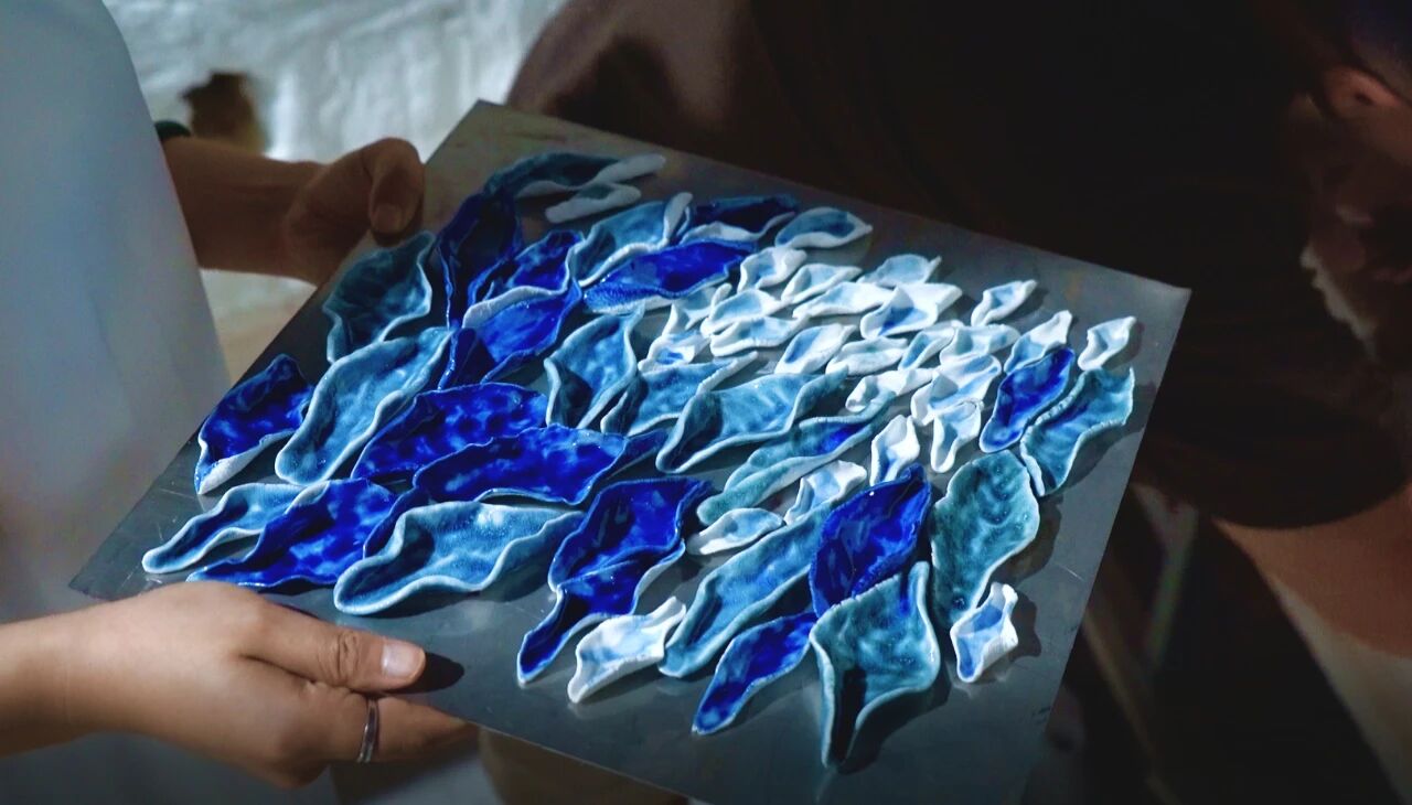 該工藝既保留了每片瓷獨特的手工質感與肌理,又通過精密的結構設計,確保了整體形態(tài)的連貫與結構的穩(wěn)固。從而使“青暉”在宏觀上呈現渾然一體的完整氣韻,在微觀處富含細膩生動的陶瓷語言,達成整體與局部的和諧統(tǒng)一。